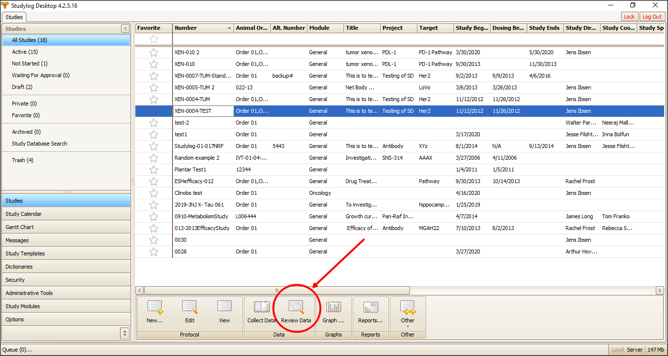 5. If you open that study in Review Data, you can see the change was applied: the study date is now Day 13 rather than Day 14.