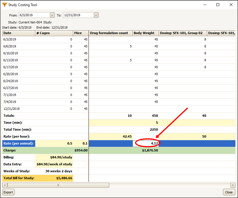 There are two numbers in the Rate (per animal) row at the bottom of the columns for the # Cages and Mice; these correspond to the cost of each cage and each animal, respectively. It is from these numbers that the Charge value is calculated, which refers here to the total cost of the animals in the study. The Billing and Data Entry costs are user-defined. The Weeks of Study amount is calculated from how long the study has been in operation. Finally, the Total Bill for Study is a combination of the total charges for each task. In this example, this is the sum of the $1876.50 calculated for the body weight task, the cost of all the animals ($954.00), the weekly data entry cost ($84.90 x 30.28... = $2571.26), and the billing cost ($84.90), which totals $5486.66.